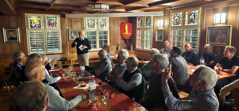 Und dann dislozieren wir in den Gemeindesaal. Geschmückt mit einer prächtigen Anzahl von Wappenscheiben wurden darin nicht nur die Gemeindeversammlungen sondern auch die Hochzeits-Zeremonien verwirklicht. Letzteres ist auch Grund für ein erstes Füllen der Zunftkanne der Grimmen Löwen durch den Zünfter Dino Giuliani, welcher den Ehebund ebenfalls in diesem Lokal geschlossen hat. Doch über Zunftkanne und Füllungen berichten wir weiter unten.