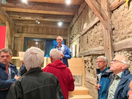 Stubenmeister Ernst Frei heisst die Grimmen Löwen in der alten Museumstrotte in Unterstammheim zum Apéro herzlich willkommen. Der Weinbau war die wesentliche Einnahmequelle der Einwohner. Das Fachwerk dieser um 1550 erbauten Trotte verdient besonderer Erwähnung.