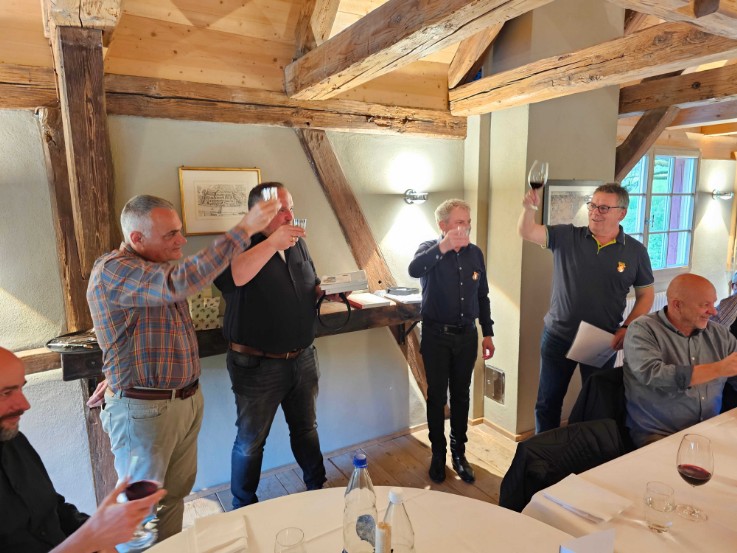 Nach dem überreichen der Zunftinsignien stossen die neugewählten Zunftherren Frank Muggli, Michael Frühwirth und Roman Giuliani mit dem Zunftmeister an.